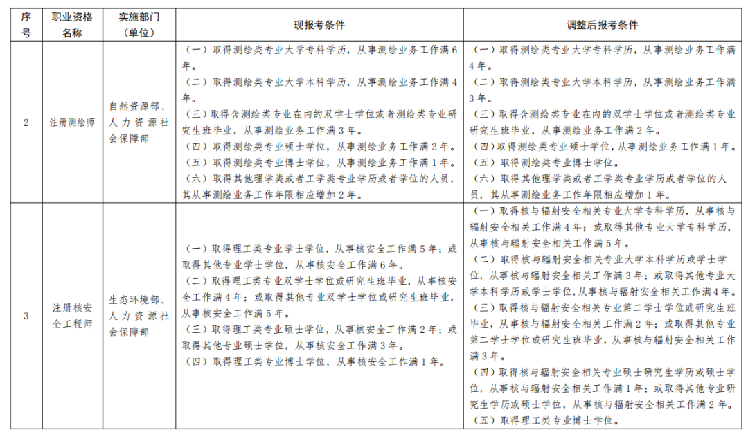 1、《部分準(zhǔn)入類職業(yè)資格考試工作年限要求調(diào)整方案》(見(jiàn)附件)自2022年起實(shí)施。除調(diào)整考試工作年限要求外,13項(xiàng)準(zhǔn)入類職業(yè)資格的其他考試報(bào)名條件不變。